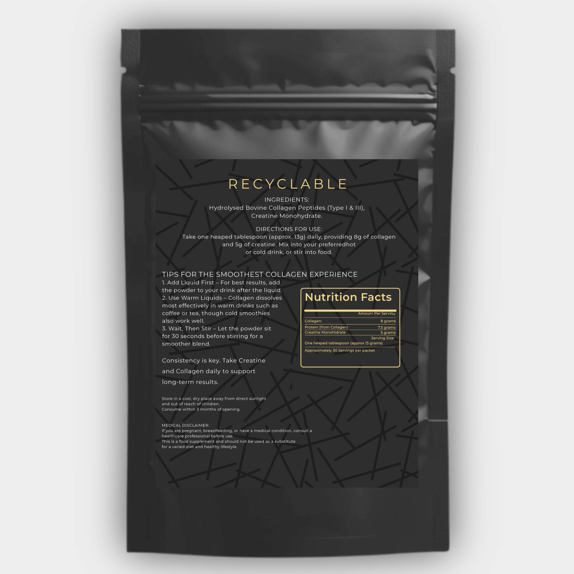 Per serving: 8 g hydrolysed collagen + 5 g creatine monohydrate