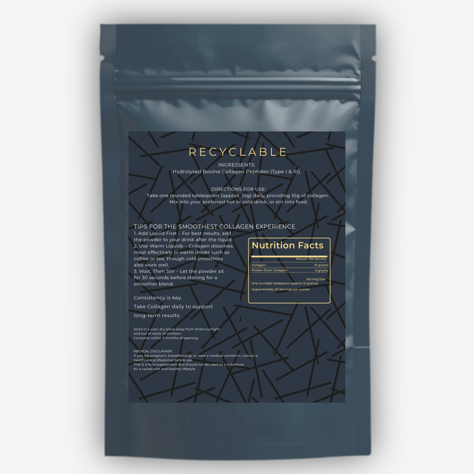 - 20 g pure hydrolysed collagen (Type I & III) per serving